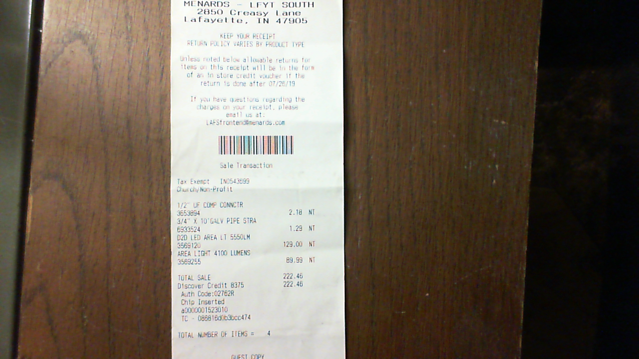 Copy of receipt for new LED security lights. These are Menard’s house brand (Patriot Lighting) and have 5 year warranty (at least on the one on the tall N pole). SecurityLights_w_accessories.png